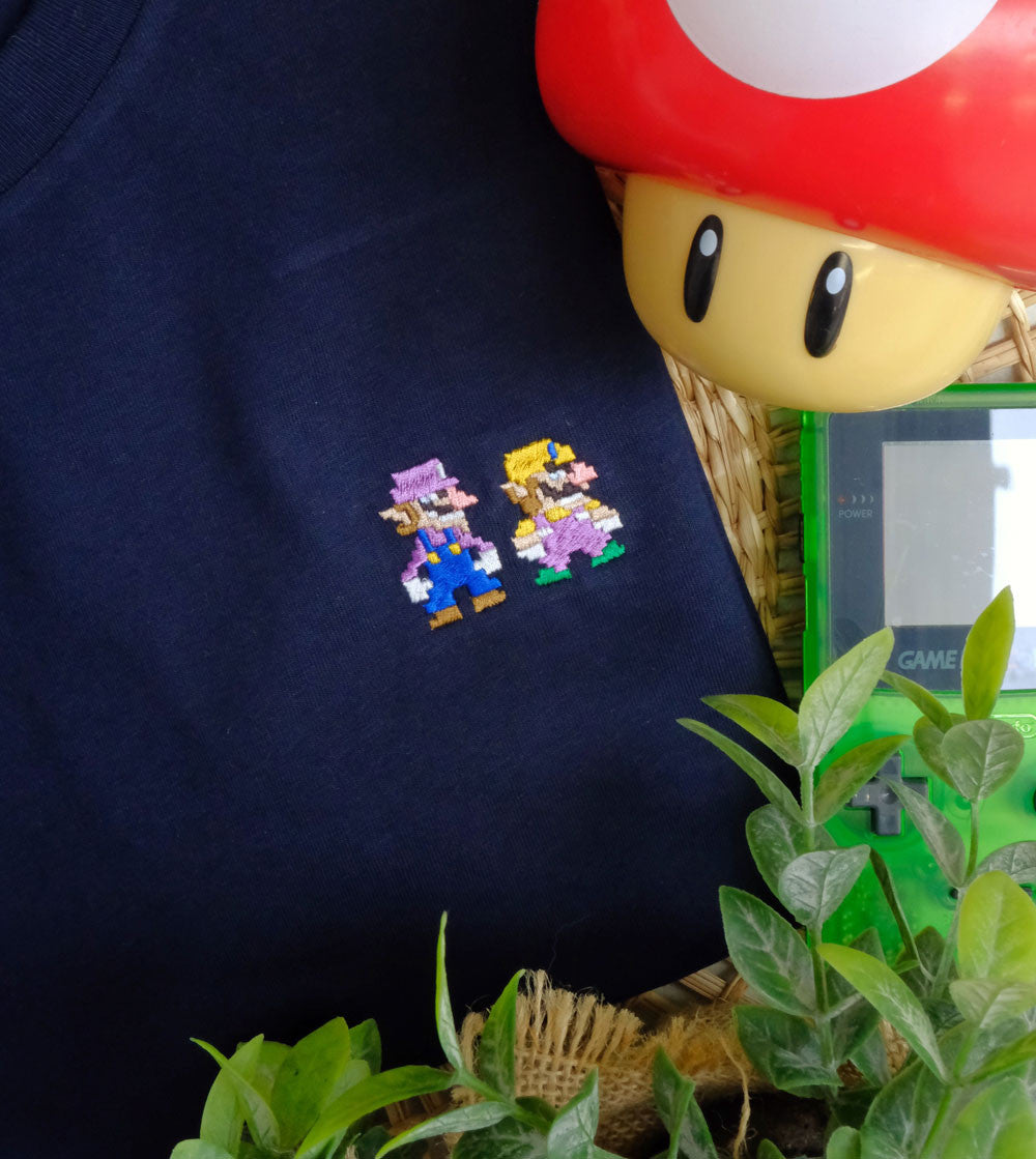 Wario et Waluigi brodés sur un t-shirt pour les fans de l'univers Super Mario et de ces méchants !
